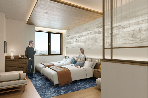 The Japanese-modern space, blending interior design inspired by the flowing river and warm townscape of Kameido-where history and culture thrive-with comfort, creates a cozy and relaxing atmosphere.Please enjoy the view of traditional downtown Kameido from the Executive Floor on the top level.